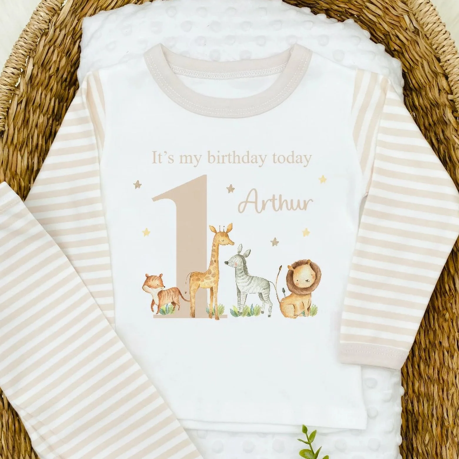 Personalised Jungle Safari Animals Beige Unisex Birthday Pyjamas