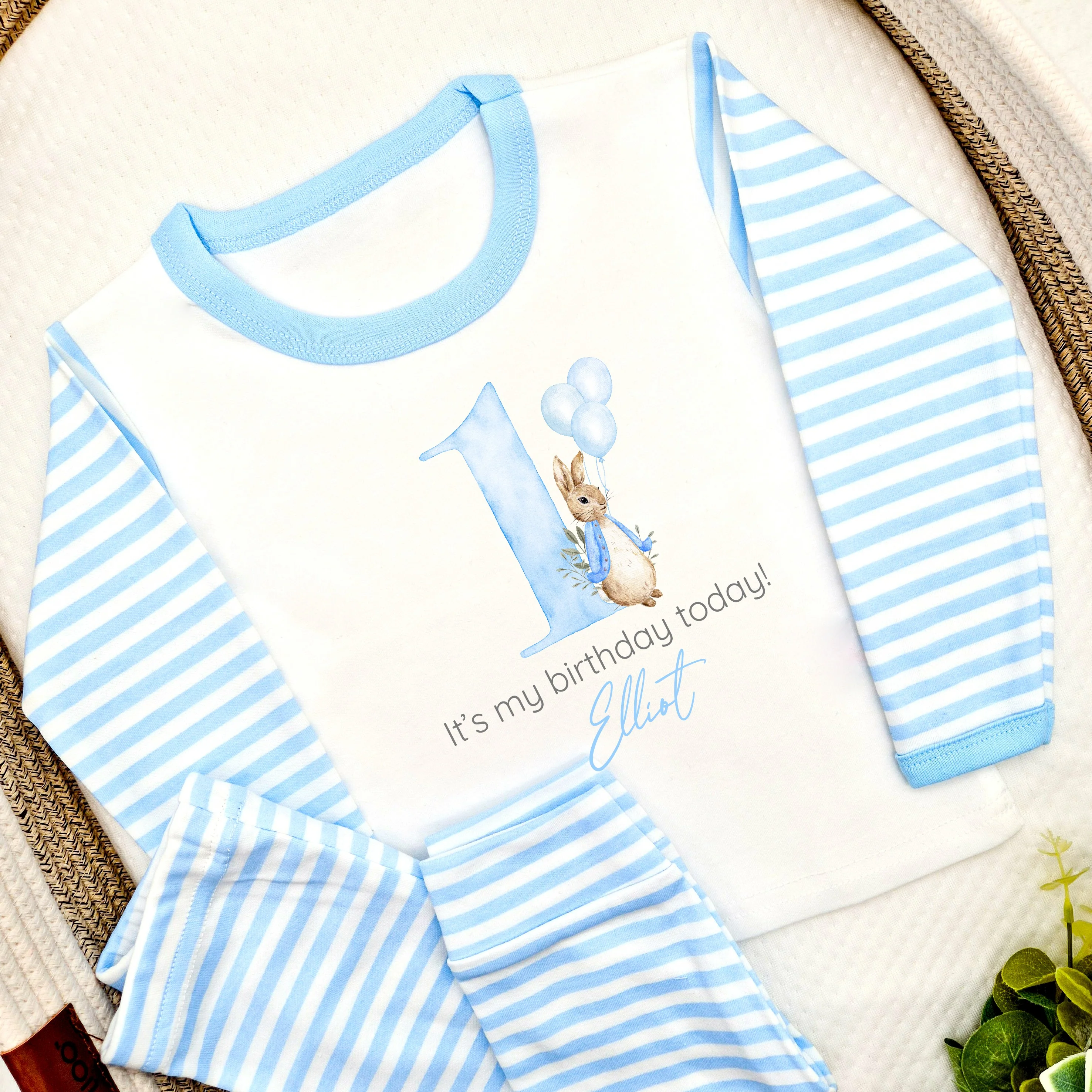 Personalised Raibbit Blue Stripe Boys Birthday Pyjamas