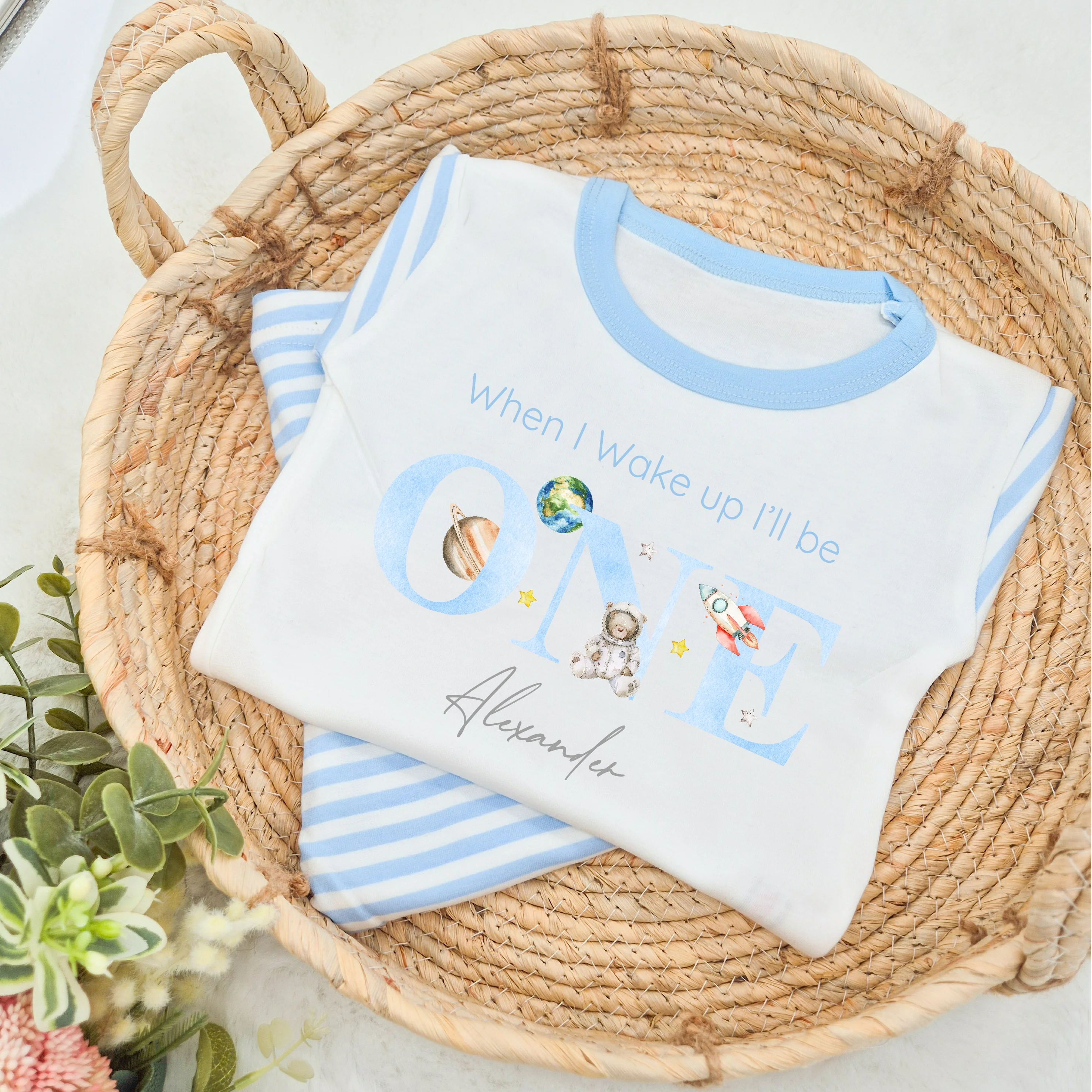 Celebrate your little one's birthday with our personalised Spaceman Blue Stripe Birthday Pyjamas! Featuring a fun and colorful design, these pyjamas can be personalized with your child's name to make them feel extra special. Made from soft and comfortable fabric, they are perfect for a cozy and memorable birthday celebration.